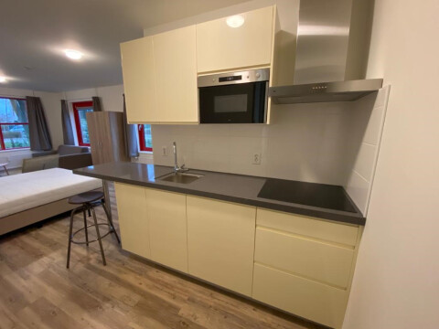 De studio is uitgerust met een keuken voorzien van een inbouw koelkast met vriesvak, een 4-pit inductiekookplaat, een RVS-afzuigkap, magnetron, wastafel met mengkraan en voldoende opbergruimte.